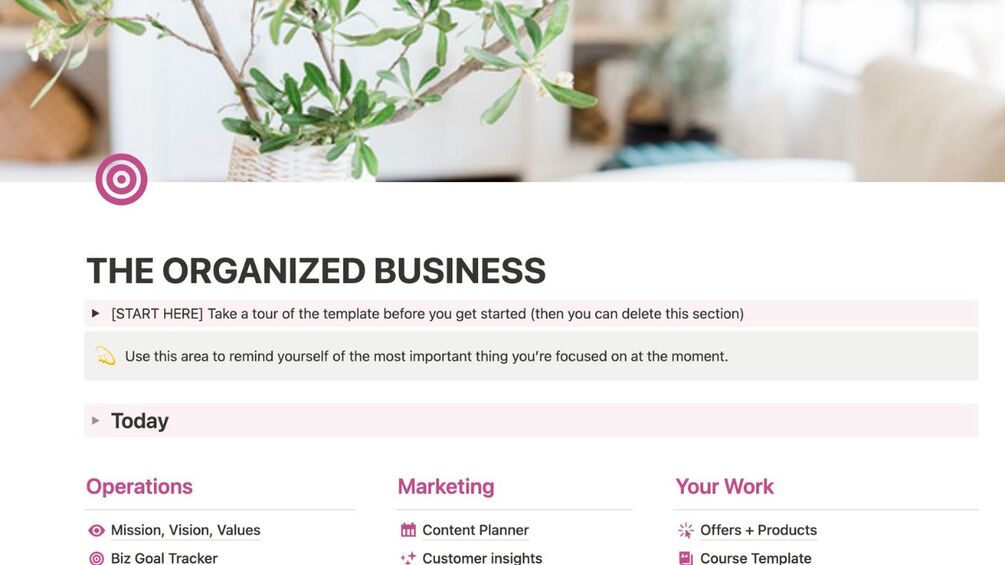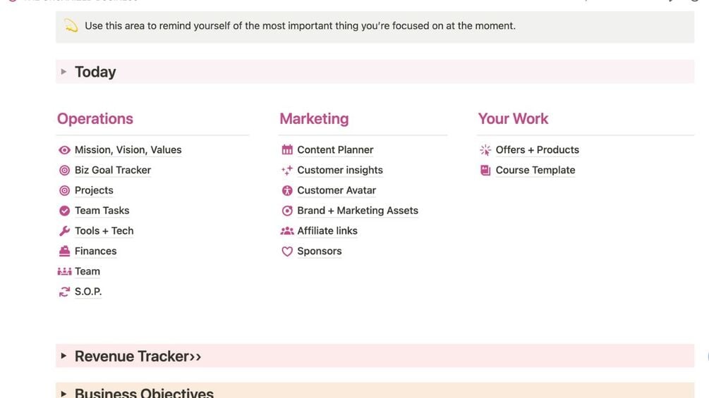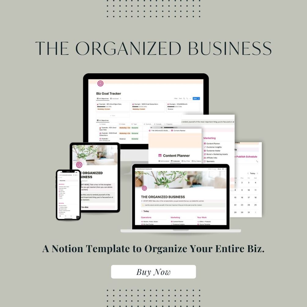 A Content Creation Database - to help you generate a consistent workflow for social media. A Business Dashboard - to help you track critical progress around finances, revenue and product development. A detailed Project + Task Tracker - to help you stay on track with new initiatives in your business and bring in help as you grow. A Business Objectives Tracker to help see your goal progress at a glance. Structured Templates to help you think through how you will onboard new team members, how to create operating procedures and what to consider when creating a new product or service.