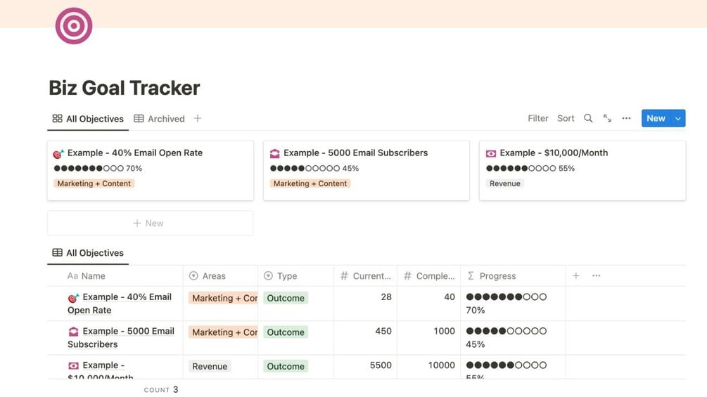 - A Business Objectives Tracker to help see your goal progress at a glance.